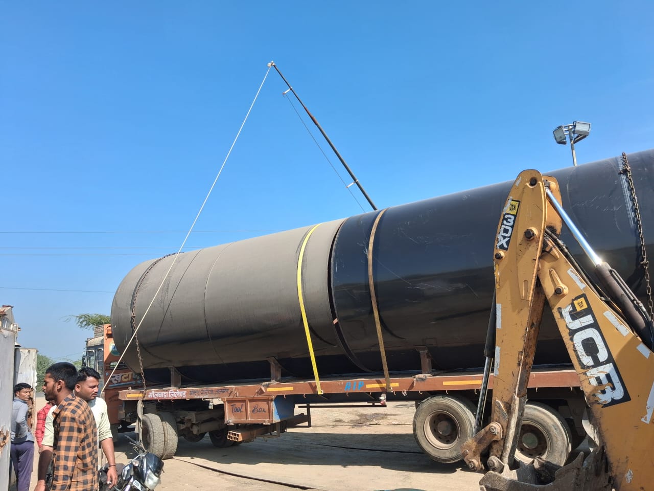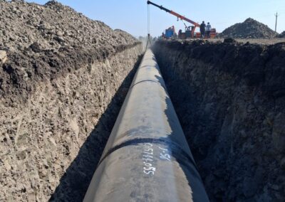 Advanced pipeline laying with heavy-duty machinery including excavators, lifters, and cranes